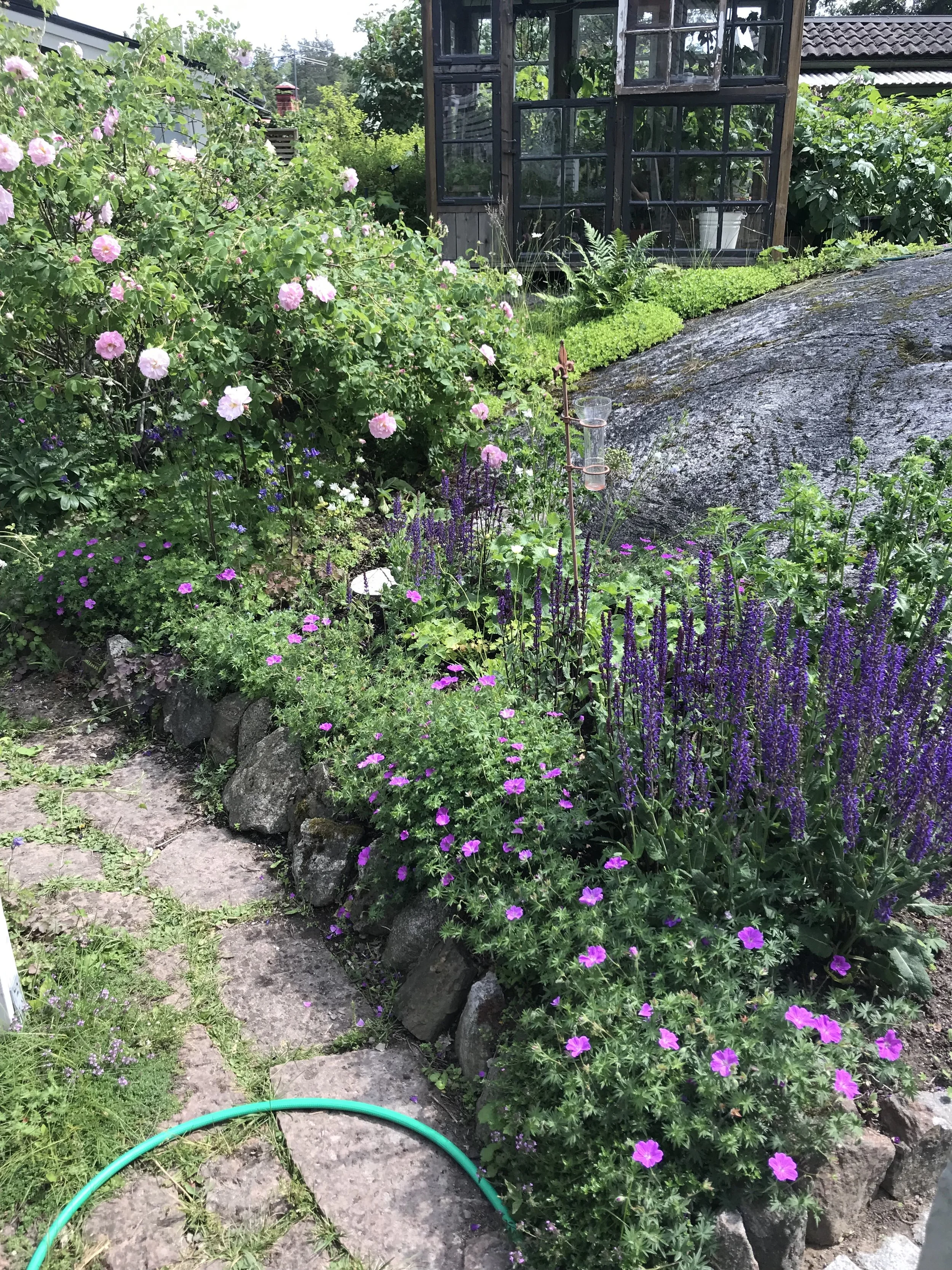 I detta projekt hjälpte jag till att strukturera upp trädgården, rensa rabatter, flytta om perenner och förenkla den lummiga färgprakten på platsen. Rabattkanter med större stenar formades och grusgångar lades. Beskärning av häckar, äppelträd och diverse andra fruktträd.